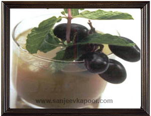 Place serving glasses in a refrigerator to be chilled. Boil and peel raw mangoes and extract the pulp. Keeping aside a few mint leaves for garnish, grind the rest.