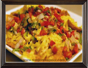 NACHOS Corn chips layered with baked beans and cheese and salsa sauce are poured on it. Preparation Time : 15-20 minutes Cooking Time : 10-15 minutes Servings : 4 INGREDIENTS Tortillas : 16 Baked beans :1/2 cup FOR SALSA :
