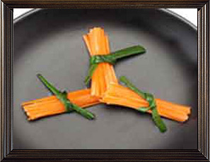 Carrot Bundles Present a dish with matchsticks of carrots. INGREDIENTS Carrot 1 medium Spring onion greens 2-3 sprigs METHOD Choose tender, young carrots. Peel thinly. Cut off a thin lengthwise slice from each carrot to make the carrot stable when